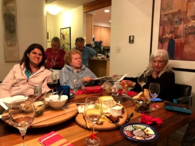 Later we sit at Lisa’s dining room table and once again enjoy charcuterie and cheeses along with suitable wines. Gary displays some of his wonderful food photography captured that morning at the farmers’ market. With so many talented cooks from the Culinary Guild a delicious dinner is prepared. An assortment of grilled dishes-steak, barbecued pork, roasted salmon, is served with freshly cut corn and late spring asparagus. Naturally wine is the favorite beverage of our group while a flaky rhubarb pie and tart lemon cake satisfy our dessert cravings.